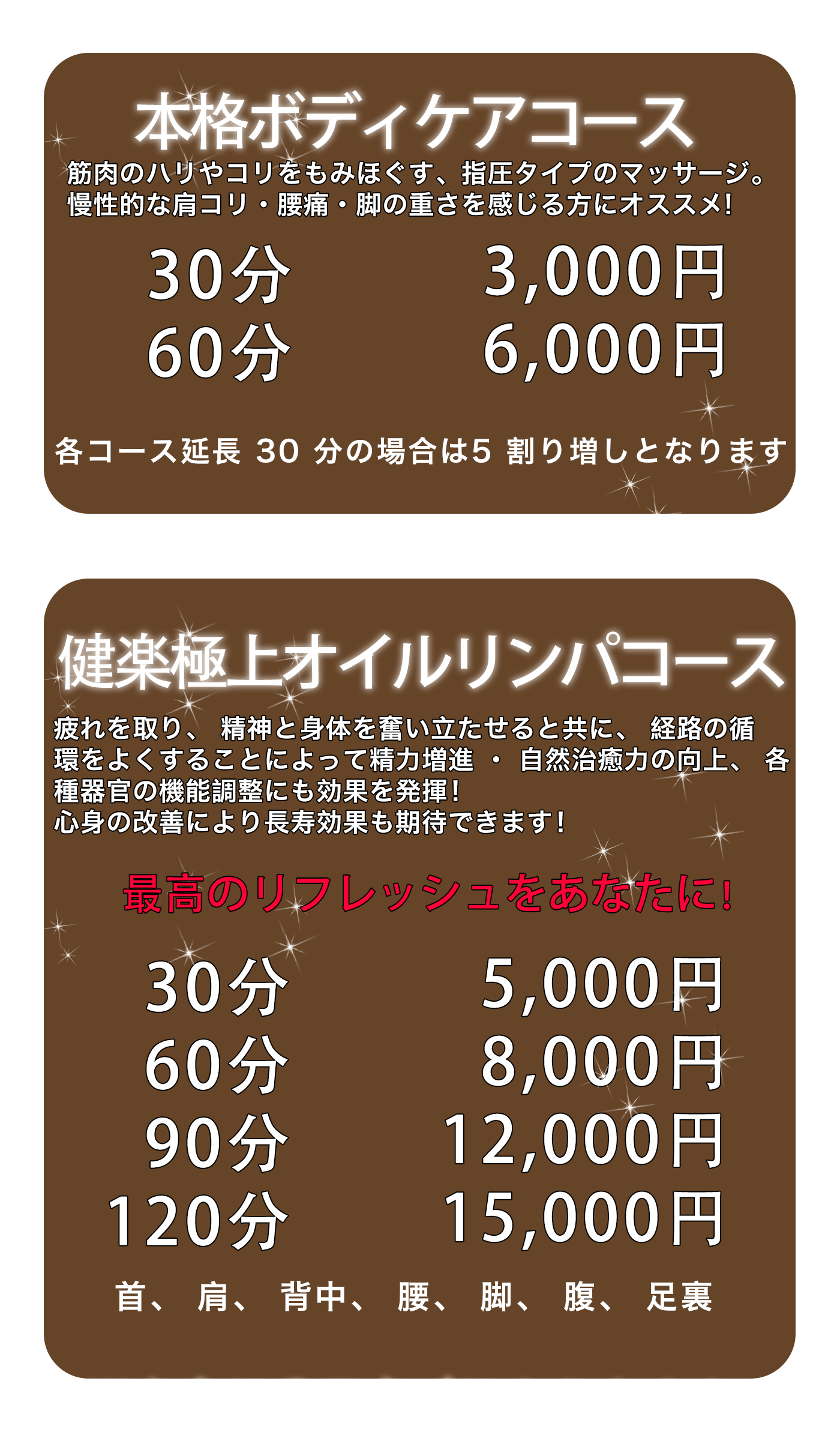 日々の疲れや、腰痛、ストレスをリフレッシュしましょう、当店では、お客様の症状に的確に応える豊富なメニューを揃えております。「マッサージは初めて…」「今日は時間がない」という方にも気軽にご来店いただけるよう、ちょっとした不調も我慢せずに後相談下さい、お客様の疲れがリフレッシュ出来ます、精一杯お手伝いさせていただきます!始めての方もおきがるにどうぞ。